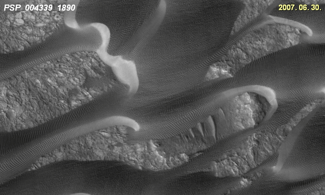 horpad![]() Regisztrált tag #120 Regisztrált: h febr 07 2011, 02:06Üzenetek: 674 | Az MRO marsszondának nagyra értékelt szokása, hogy rendszeresen visszatér az előzetesen lefényképezett területek fölé. így a legkisebb változás is azonnal szembetűnő lehet. í‰s ennek a jó szokásának köszönhető az alábbi friss összeállítás is a dűnék mozgásáról egy másik régióban. Kell hozzá a jó szem, hogy látható legyen, mennyit görgetett rajtuk a szél az elmúlt időszak során. A terület nagysága 960x575m, ebből már lehet következtetni a dűnék valós méretére. [ Módosítva h nov 28 2011, 04:50 ] | ||