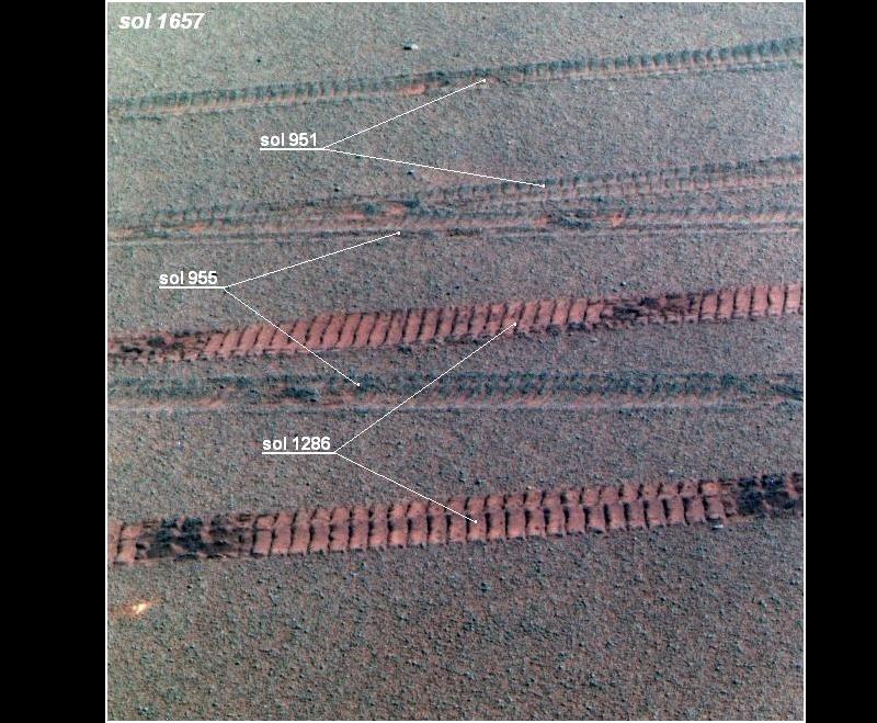 horpad![]() Regisztrált tag #120 Regisztrált: h febr 07 2011, 02:06Üzenetek: 674 | A marsi szél valós képességeinek meghatározásához további adalék lehet az alábbi felvétel. Miután az Opportunity befejezte a Victoria kráter körüli bolyongását, a sol 1657.-ik napon visszatért a kezdeti csomóponthoz, hogy aztán végleg dél felé vegye az irányt. Előtte viszont három régi keréknyomot kellett kereszteznie. Ezek a nyomok közel kétévesek! íllapotuk alapján következtetni lehet az elmúlt hónapok ’széljárásaira’. ![]() [ Módosítva cs dec 08 2011, 01:50 ] | ||