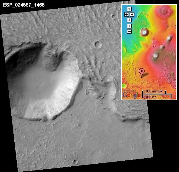 horpad![]() Regisztrált tag #120 Regisztrált: h febr 07 2011, 02:06Üzenetek: 674 | í‰rdekes felvételt találtam a legújabb Hirise csomagban. (2011 október 25.-én készült) Ez most kivételesen nem becsapódás, hanem vulkanikus eredetű kráter, amely besüllyedés által jött létre, és vélhetően nagyon régi. A megmaradt perem sikeresen állt ellen egy későbbi, a Tharsis vulkánok irányából érkező lávafolyam ostromának. (Egy óvatos kételkedés: Lehet, hogy nem is láva, hanem sárfolyam?) A nagyobb mérethez Katt ide! . ![]() | ||