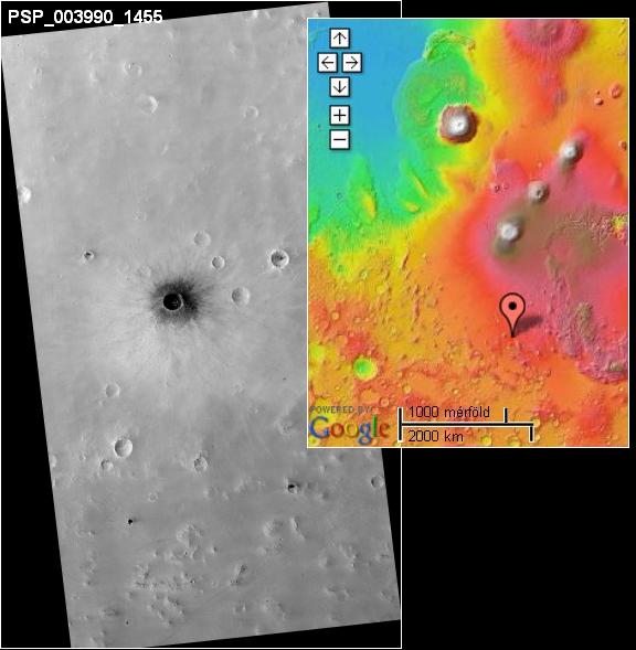 horpad![]() Regisztrált tag #120 Regisztrált: h febr 07 2011, 02:06Üzenetek: 674 | Friss becsapódás 2008 január és 2011 augusztus között az Ascraeus Mons-tól északra. Az apró kráter átmérője kb 11m. A felvétel időpontja 2011 november 13. ![]() | ||